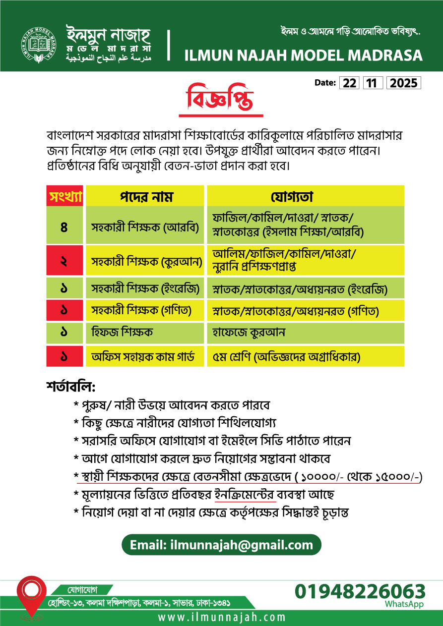 আগ্রহীদেরকে ৩০ নভেম্বর ২০২৫ -এর মধ্যে সিভিসহ মাদরাসার অফিসে যোগাযোগ করার জন্য অনুরোধ করা যাচ্ছে।
